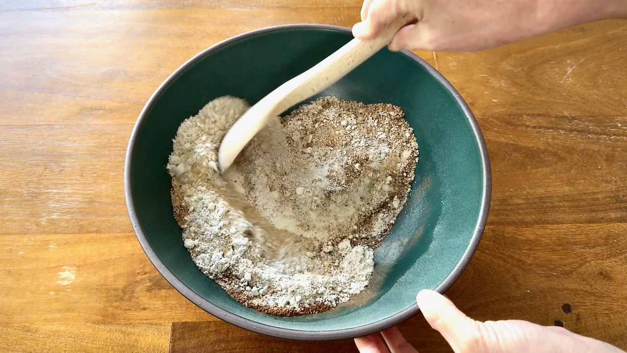 In another mixing bowl, combine the all-purpose flour, whole wheat flour, oat flour, hazelnut (or almond) flour, date powder, cinnamon, and salt. Stir well.