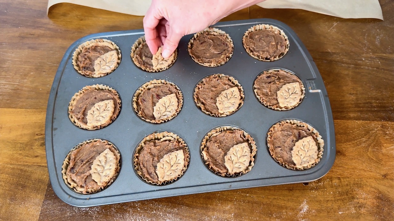 Press one leaf cutout and one acorn cutout on top of each pie, slightly overlapping, such that the edges of the cutouts rest on the outer crust of each pie.