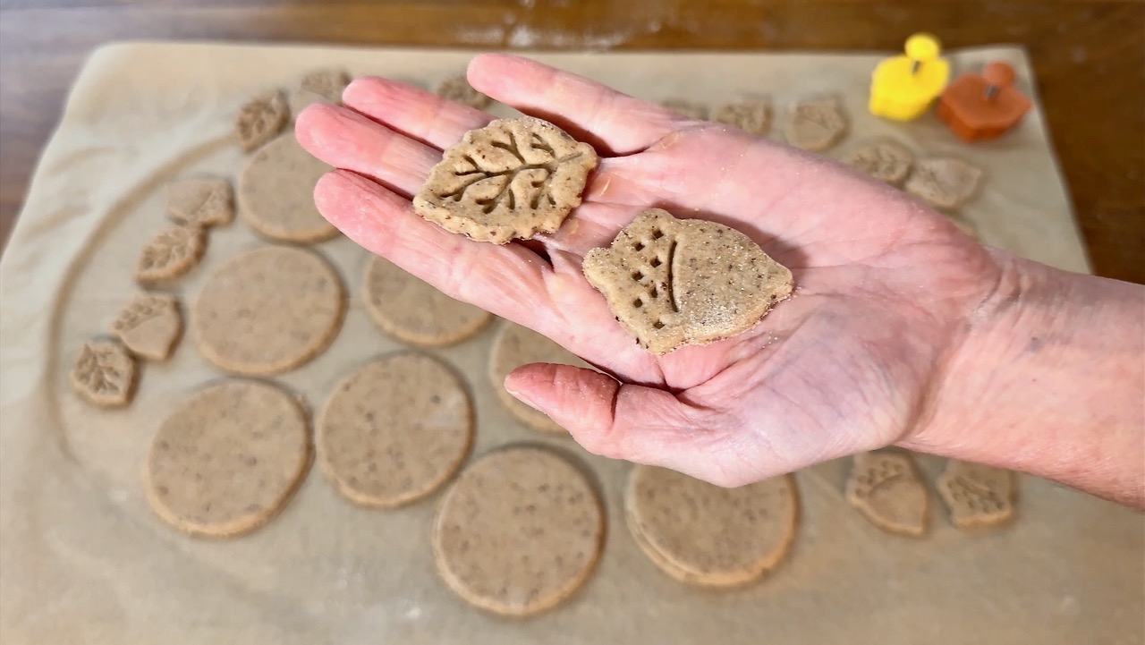 Use acorn- and leaf-shaped cookie cutters (equipment links below) to cut 12 acorns and 12 leaf shaped pieces into the remaining dough.