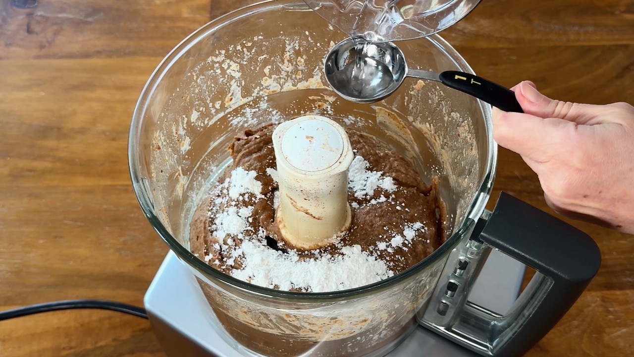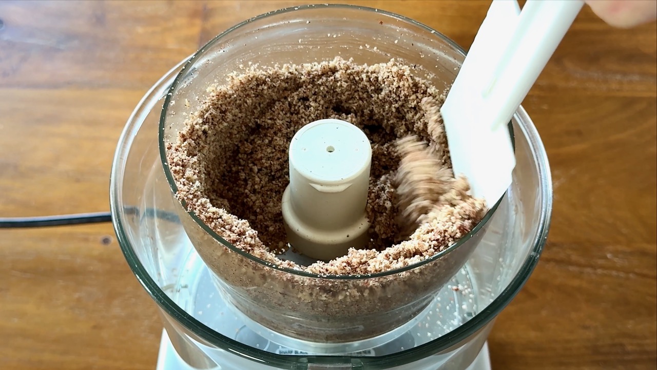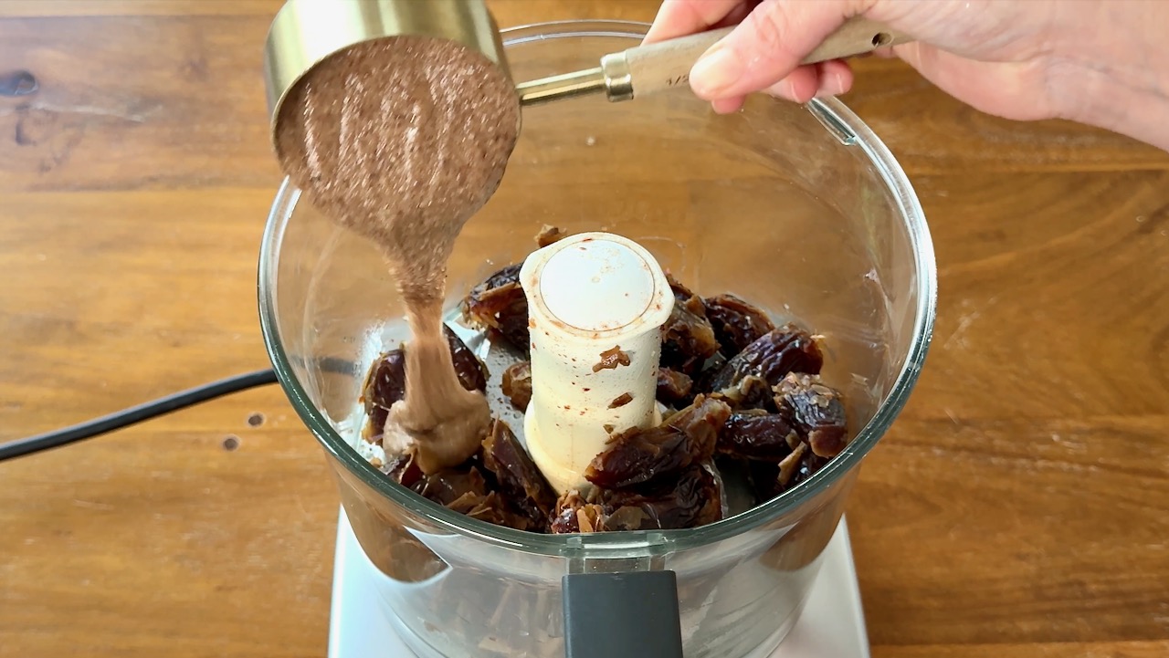Drain the dates of their soaking water and transfer them to the large bowl of a food processor. Add ½ cup of your homemade pecan butter to the dates.