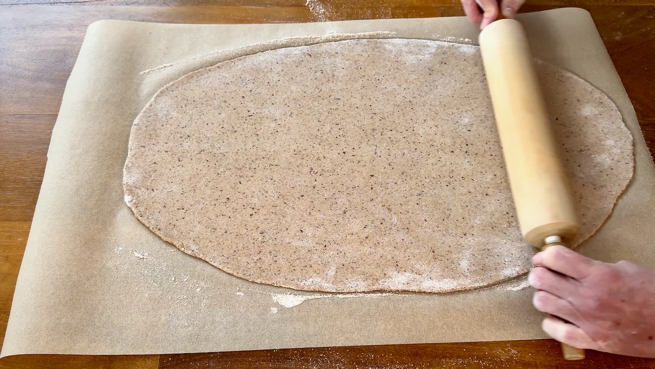 Then use a rolling pin to roll the dough out until it's about ⅛ inch thick.