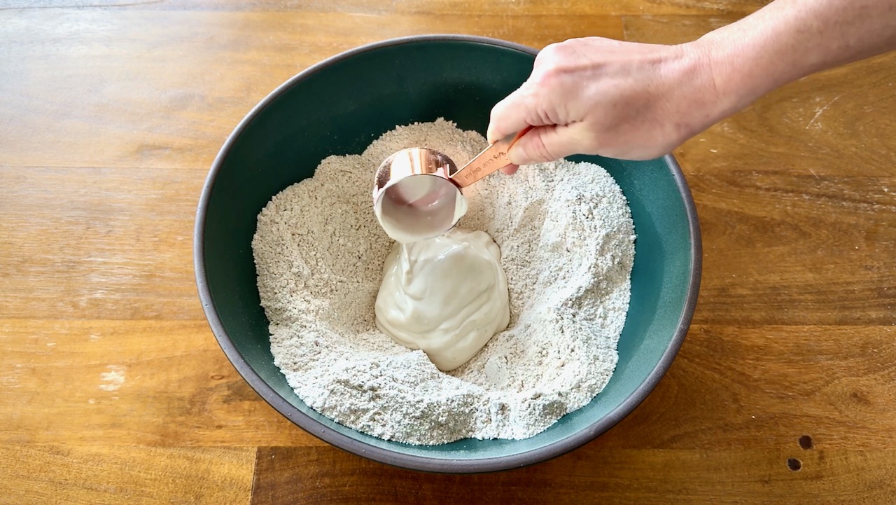 Cut the yogurt into the dry ingredients until it forms a shaggy consistency. A pastry blender (aka "pastry cutter") is the best tool for this, but you can use a fork and/or a silicone spatula instead if that's what you've got. Scroll down for equipment links.