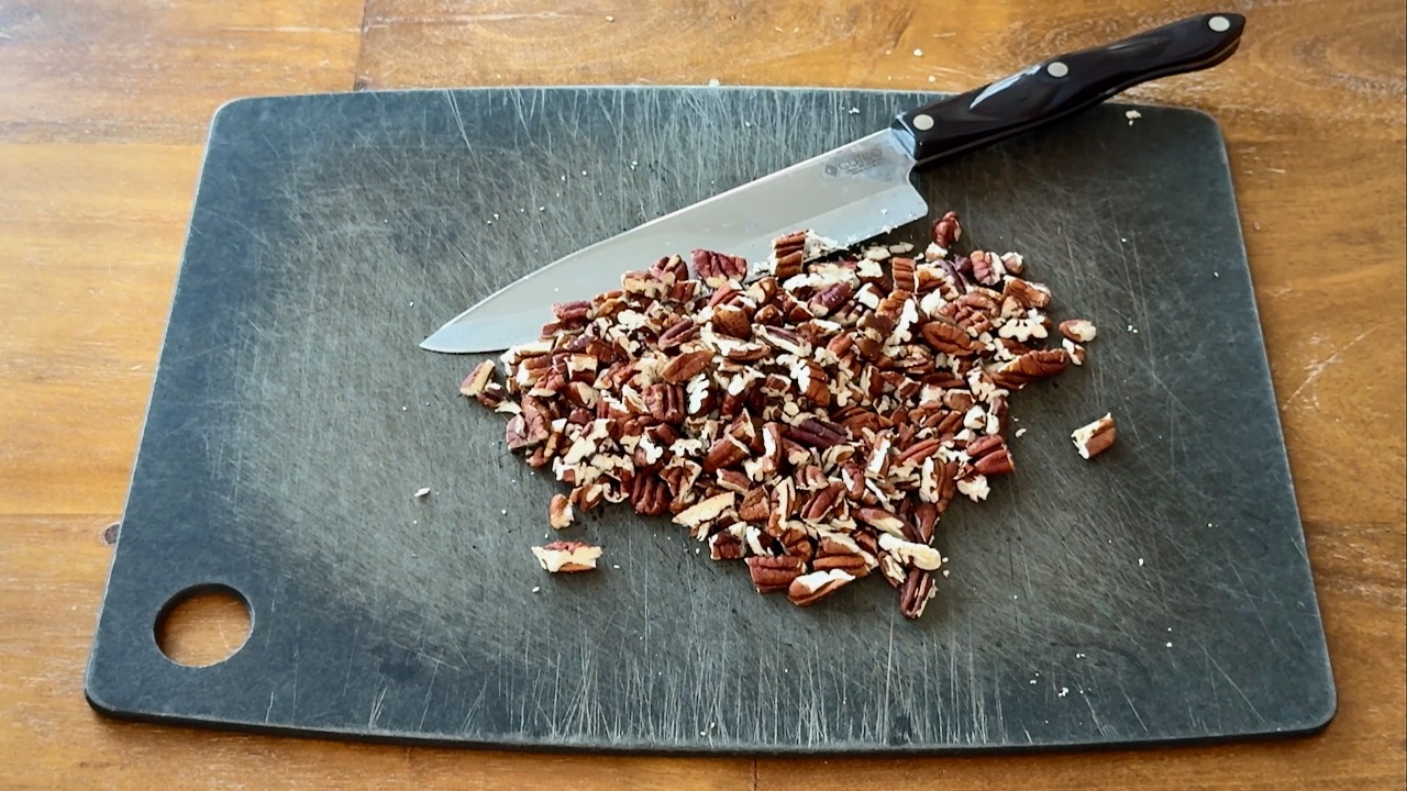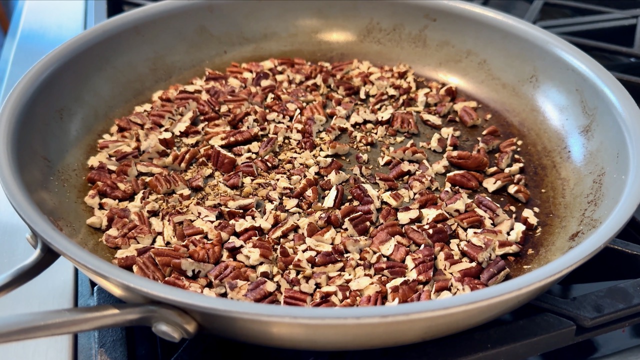 💡 Helpful Tip: Don't try to do other things while you're toasting the pecans. It's just too easy to forget about them, and they go from toasted to burned very quickly if you're not paying attention (which is really sad!) so just spend a few short minutes attending to your pecans while they toast in the pan.