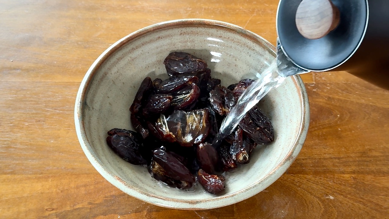 Place the pitted dates in a bowl and cover them in hot water. I usually use my kettle for this task. Set them aside to soften, which will likely only take about 15-20 minutes, depending how dried your dates were to begin with.
