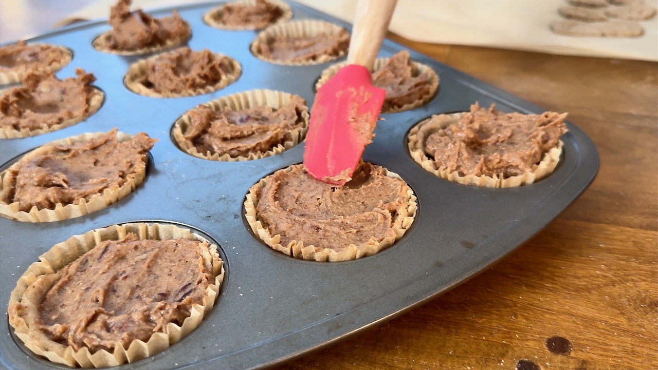 Line a muffin pan with parchment baking cups and preheat the oven to 375°F.