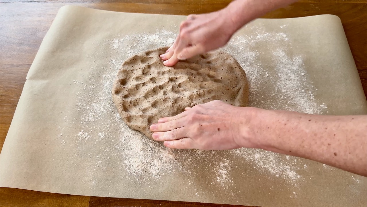 Press the dough into a flat disc, then place the disc on the paper and continue pressing it out as much as you can with your hands.