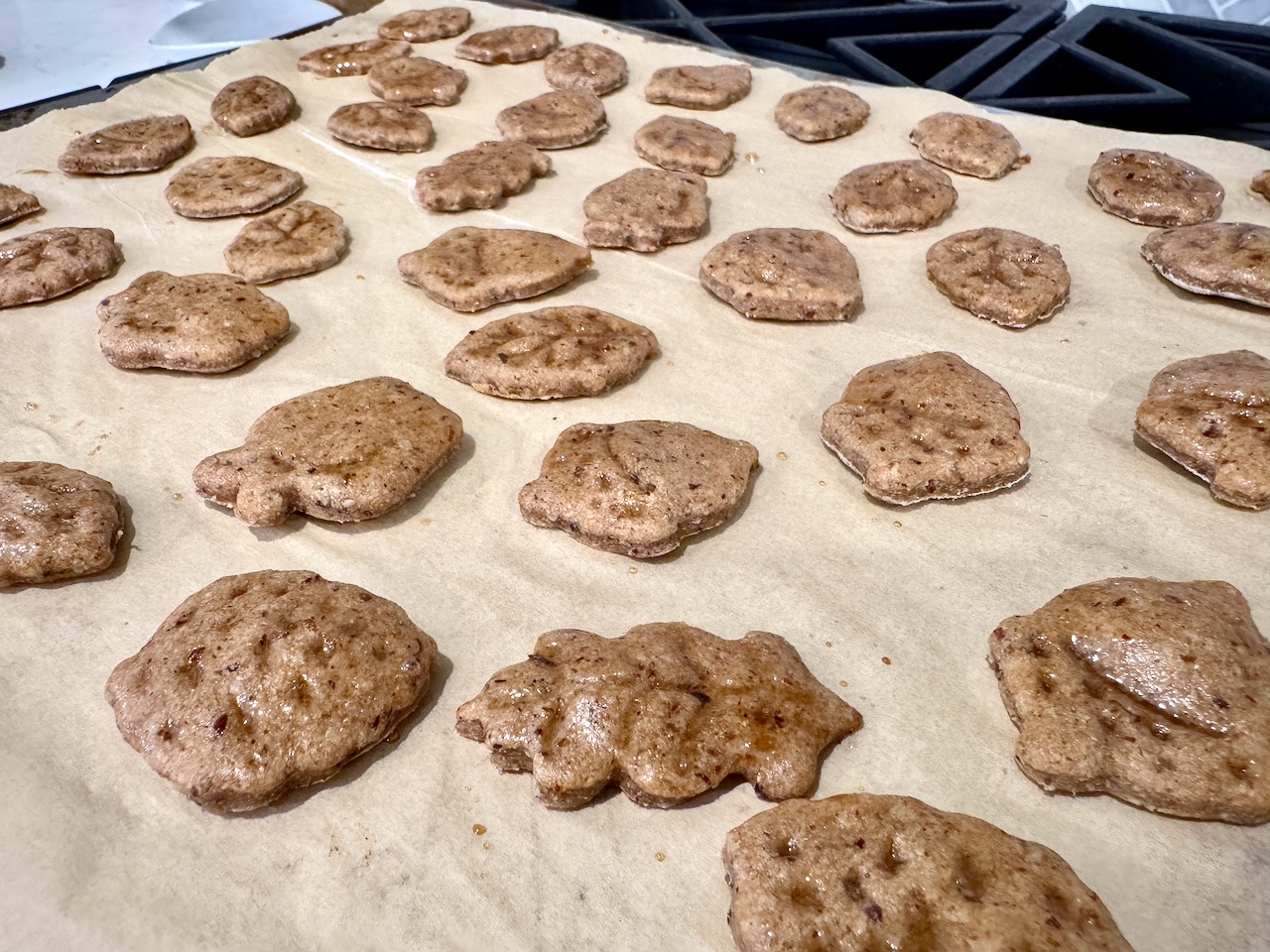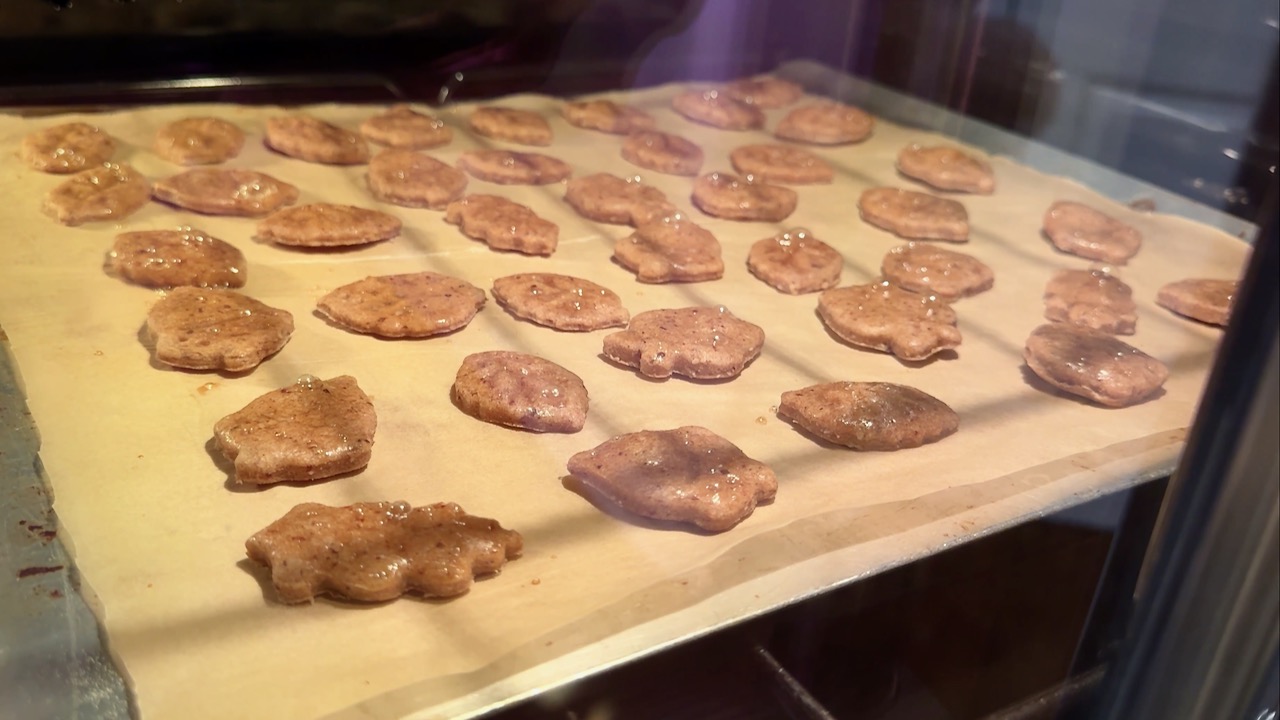 Then sprinkle each with the date power + spice mixture, which will adhere to the cookies thanks to the maple syrup.