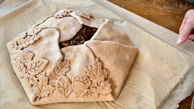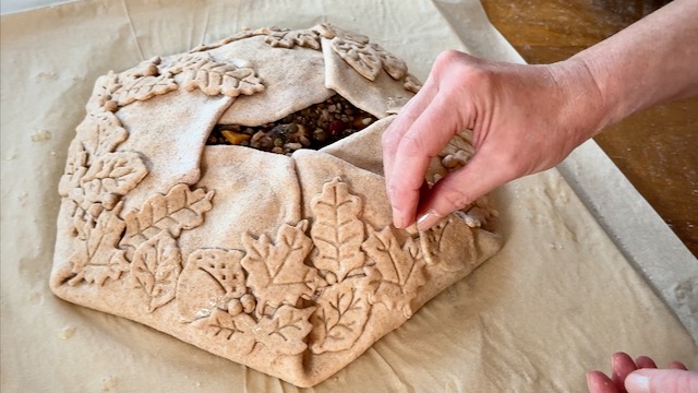 If you have leaves left, begin stacking them up the sides of the galette. This creates the illusion of an accumulation of fall leaves, or like they're growing up the sides on a vine.