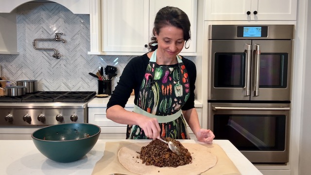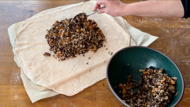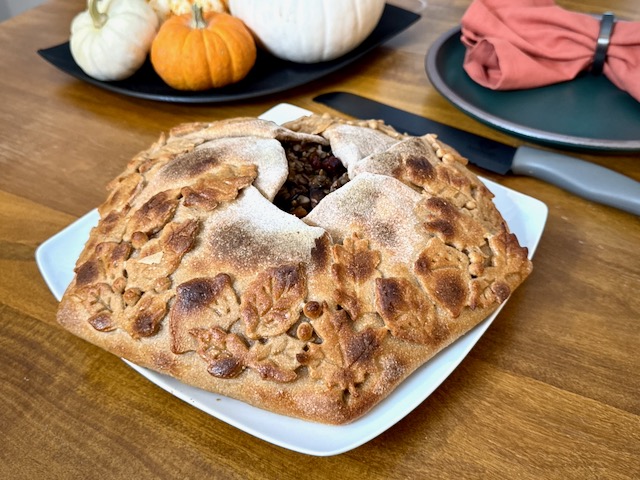 Make a show-stopping plant-based holiday main course with this rustic free-form savory pie filled with wild rice, French lentils, butternut squash, sautéed mushrooms, caramelized shallots, cranberries, and walnuts.