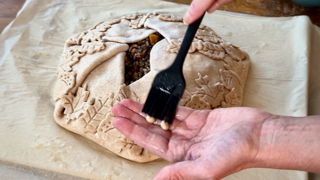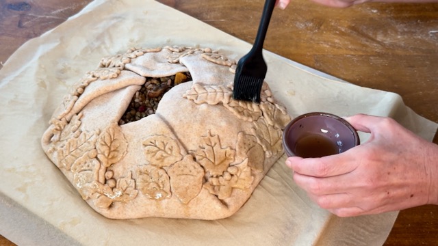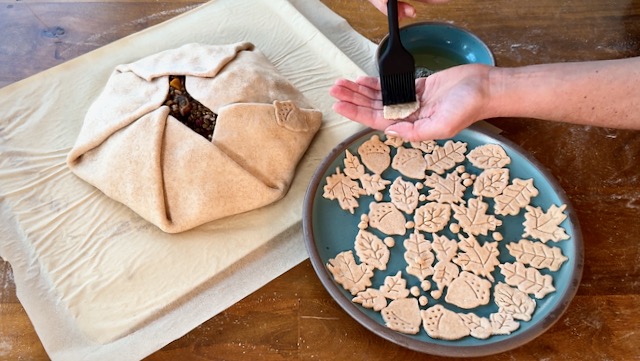 To adhere the leaves to the galette crust, use a silicone pastry brush to paint a thin layer of aquafaba on the back of each dough leaf. Brush some aquafaba on the galette where you'd like to place each leaf.