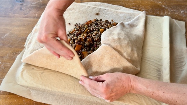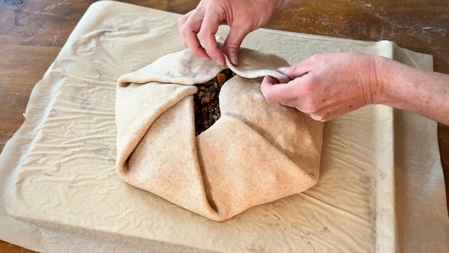 Place the filling mixture in the center of the crust, leaving a substantial margin all the way around.