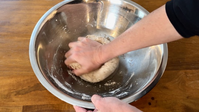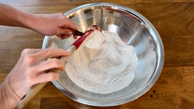 Add ½ cup of water and stir until the dough forms a cohesive ball, adding more water as needed, 1 or 2 Tbsp at a time, using only the very minimum amount necessary to pick up all the loose flour in the bowl.