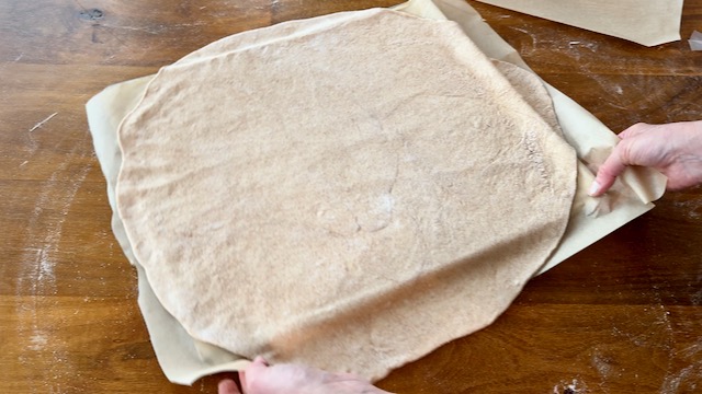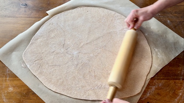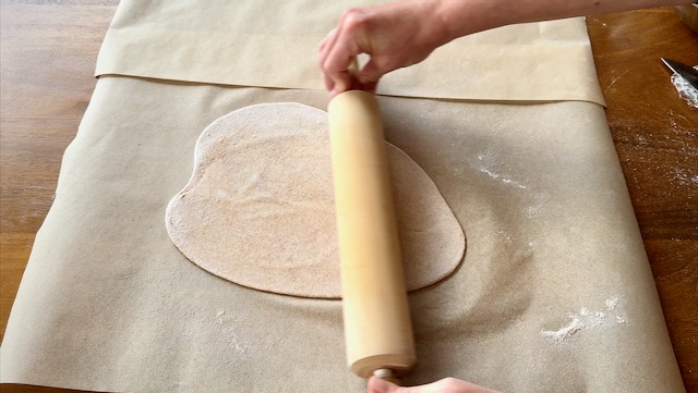 Lightly flour a parchment-lined work surface. I usually tape two pieces of parchment together to form a larger work surface.