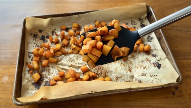 Spread the squash over the baking sheet in a single layer (in other words, try to avoid overlapping the pieces) and roast for 30 minutes, flipping with a spatula once at about the 20-minute mark, to ensure the pieces will roast evenly.