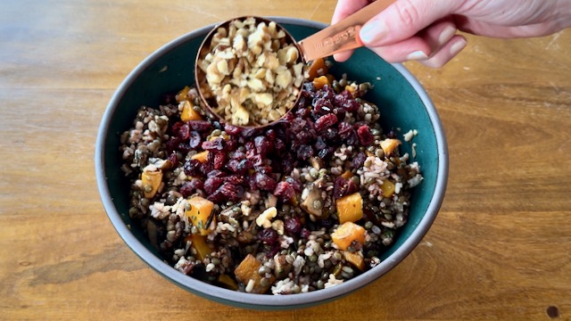 In a mixing bowl, combine the cooked wild rice and lentils, roasted squash, sautéed mushrooms, and caramelized shallots. Stir.