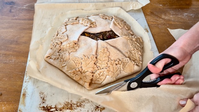 Note: If you do this too, remember to remove the tape before baking, and transfer the galette crust to a single layer of parchment, as show in the video, just to make it easier to slide a baking sheet under the whole thing.