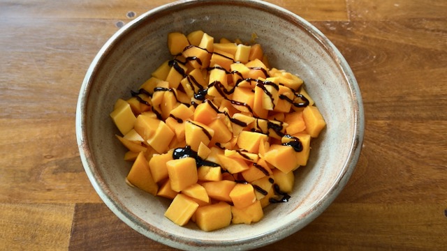 Drizzle with fig balsamic vinegar (or regular balsamic vinegar if you don't have the fig-sweetened variety) to taste, just be careful not to add too much; start with just 1 Tbsp at first.