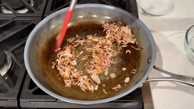 Heat the avocado oil (or veggie broth) in a frying pan over medium-high heat. Add the sliced shallots, sprinkle with salt, and stir. Continue cooking, stirring occasionally, until the shallots have browned.