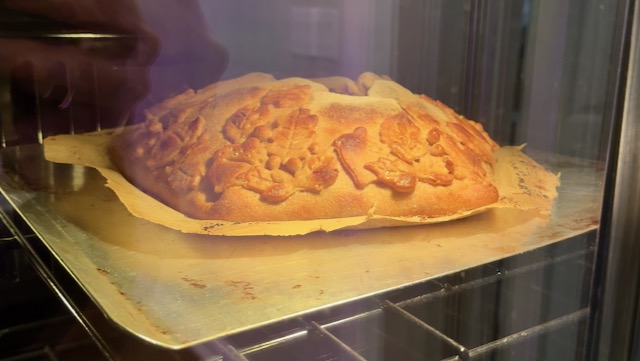 If you're doing the dough leaf decoration, cut off about ¼ of the dough. Roll it out until it's ⅛ inch thick.