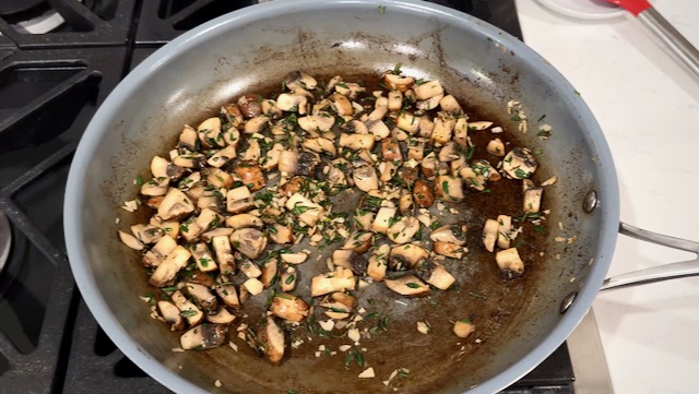 When the mushrooms begin to release their own moisture, add the minced garlic, rosemary and thyme. Continue stirring for another 2 minutes. Turn off the heat and set aside.